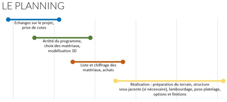 Assurez l'esthétique, la durabilité et la sécurité de votre terrasse bois en auto-construction. en vous appuyant sur l'expérience d'un pro. Nous vous apportons :
