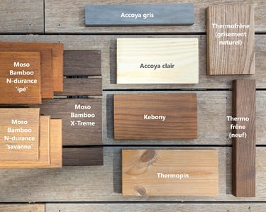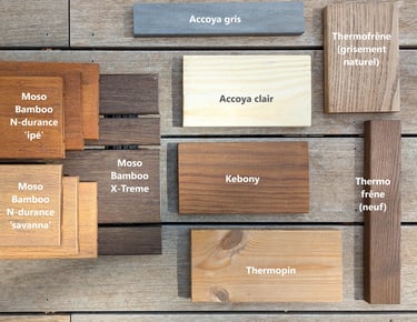 Principales références disponibles : Thermopin, Kebony (pin), Accoya (pin), Thermofrêne, Moso Bamboo